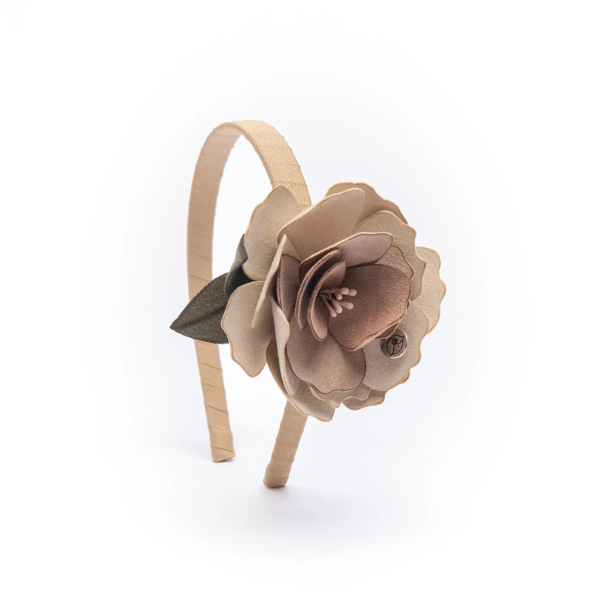 Diadema floral forrada en cinta de faya, diseñada por Miss Bee y elaborada cuidadosamente a mano con precisión en microsuede vegano y apliques.