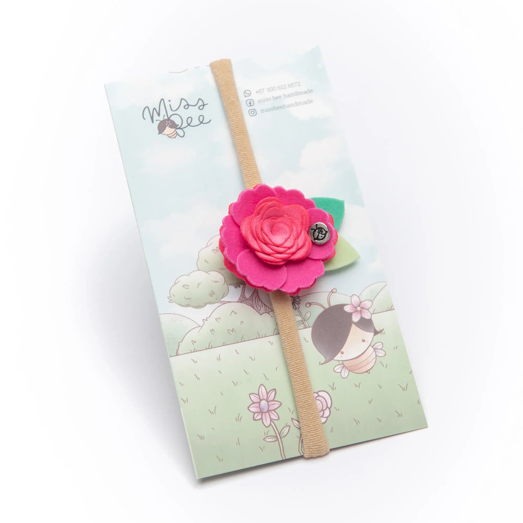 Diadema elástica en nylon súper suave, que se adapta a la cabecita de la bebé sin tallarle. La florecita fue diseñada exclusivamente para Miss Bee en PU Suede y apliques, pensando en las abejitas más pequeñas.