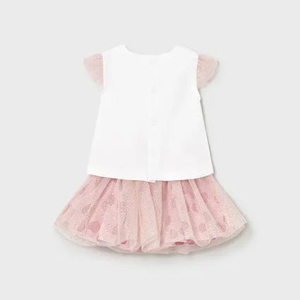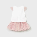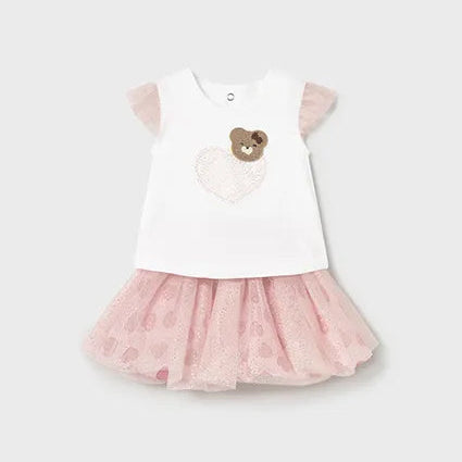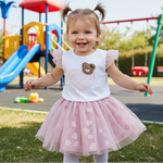 Dulzura y encanto en un solo look. Este conjunto combina una blusa blanca con delicadas mangas de tul y un tierno bordado de osito sobre un corazón, con una falda de tul rosa con lunares brillantes que aporta volumen y movimiento. Perfecto para momentos especiales o para dar un toque mágico al día a día.