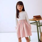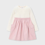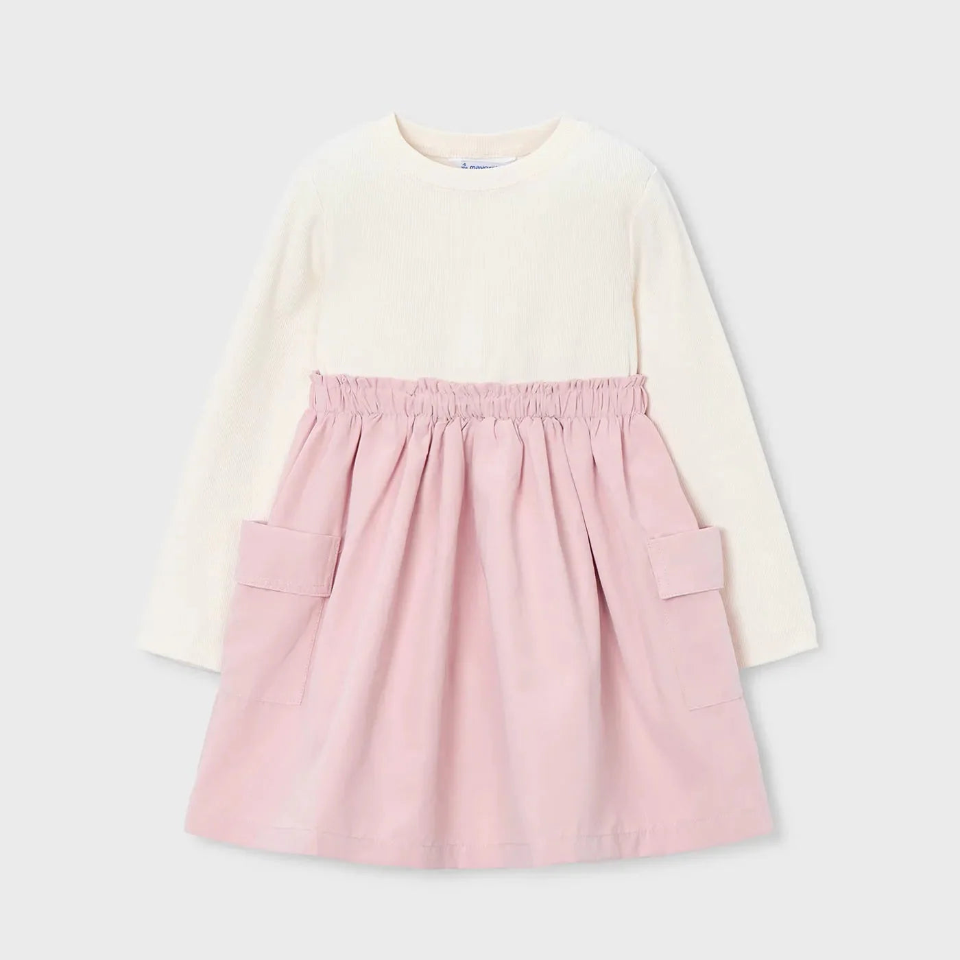 Vestido de manga larga para niña con cuello redondo. Diseño con camiseta en superposición y cinturilla elástica. Confección combinada con cuerpo y falda en distintos tejidos para conseguir un diseño único y especial. Modelo con rizo. Bolsillos en los laterales.