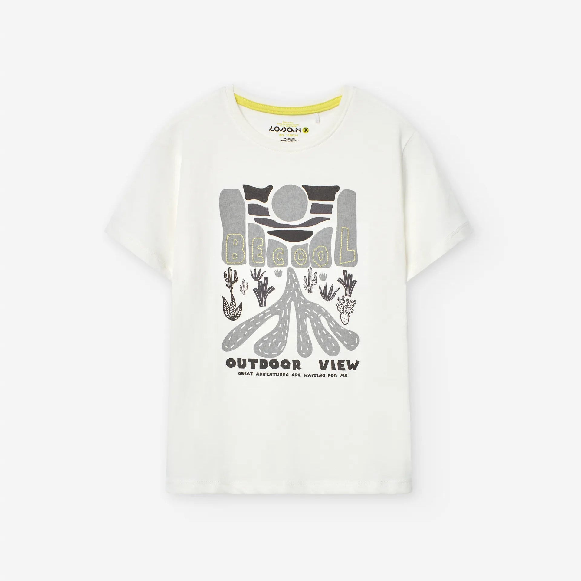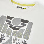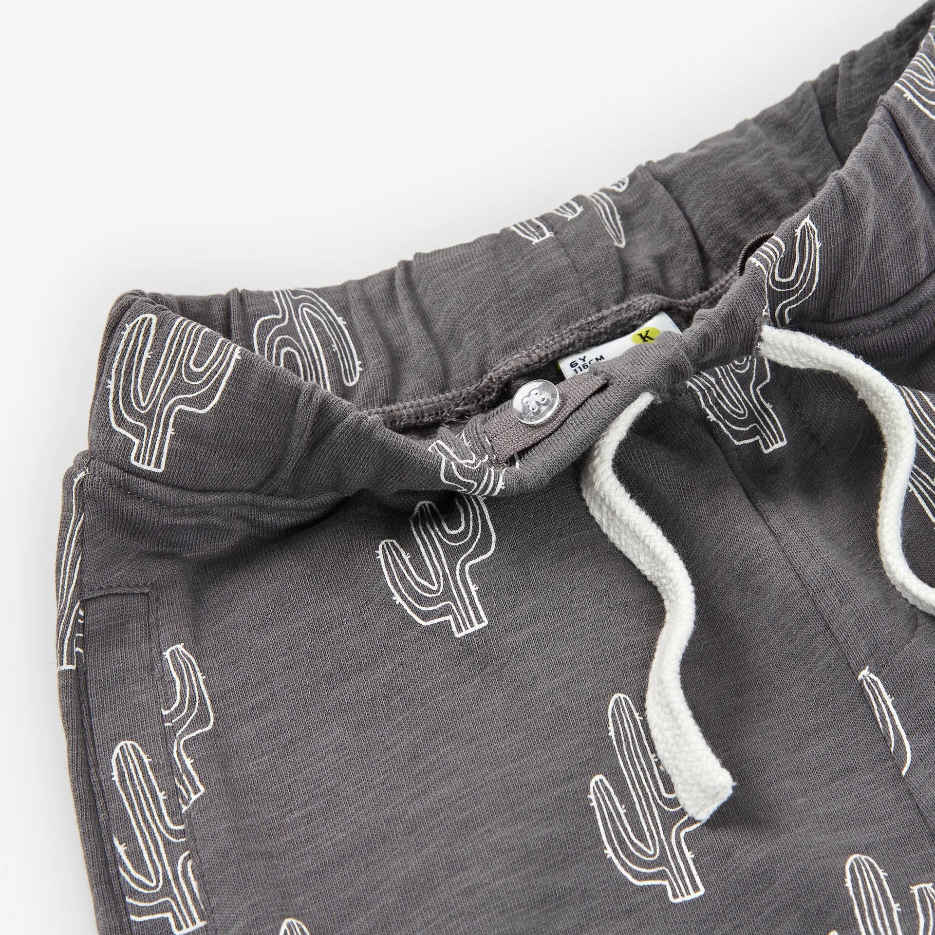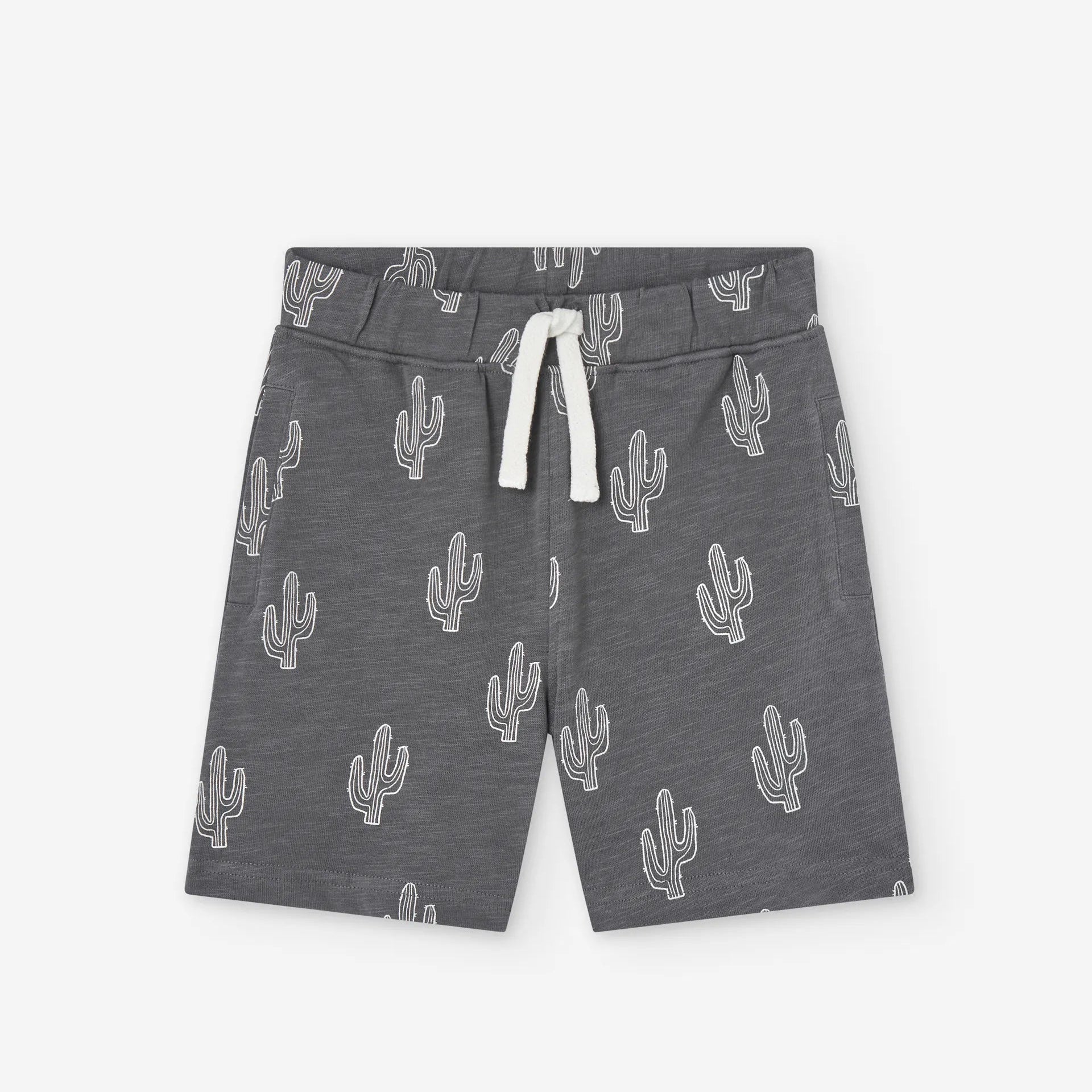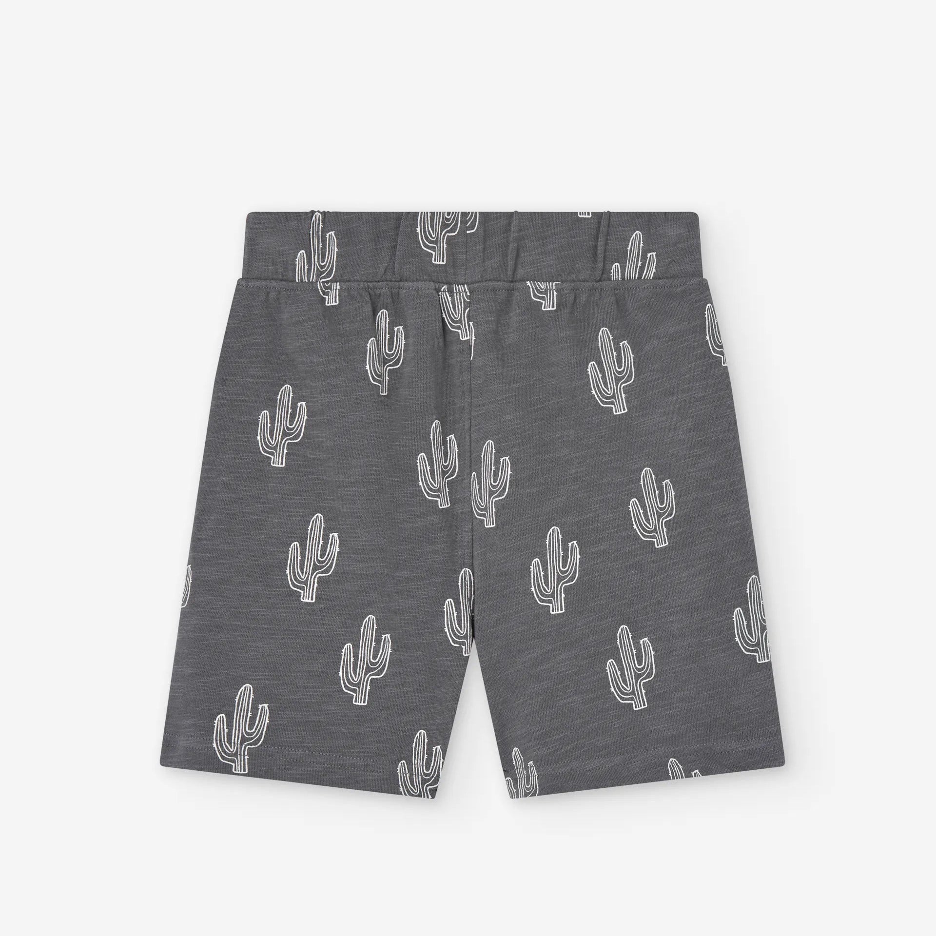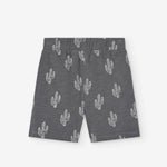 Este conjunto para niño combina una camiseta blanca suave con bermudas estampadas en tonos gris y blanco, inspirada en paisajes del oeste. Su cordón ajustable garantiza comodidad en cada movimiento. Ideal para días de juego con mucho estilo.
