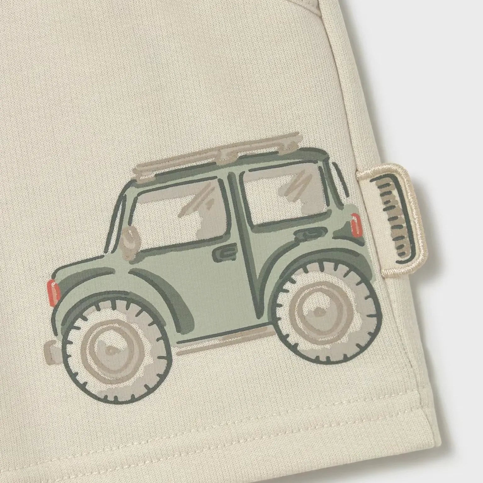 Bermuda con cordón a tono en la cintura para un mejor ajuste, aplique jeep interactivo y bolsillos delanteros.