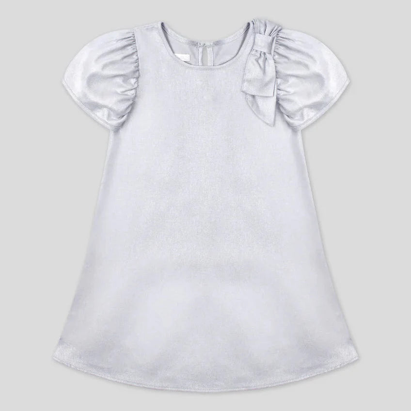 Nuestro vestido plateado con brillos y un dulce moño en el hombro es perfecto para momentos especiales.