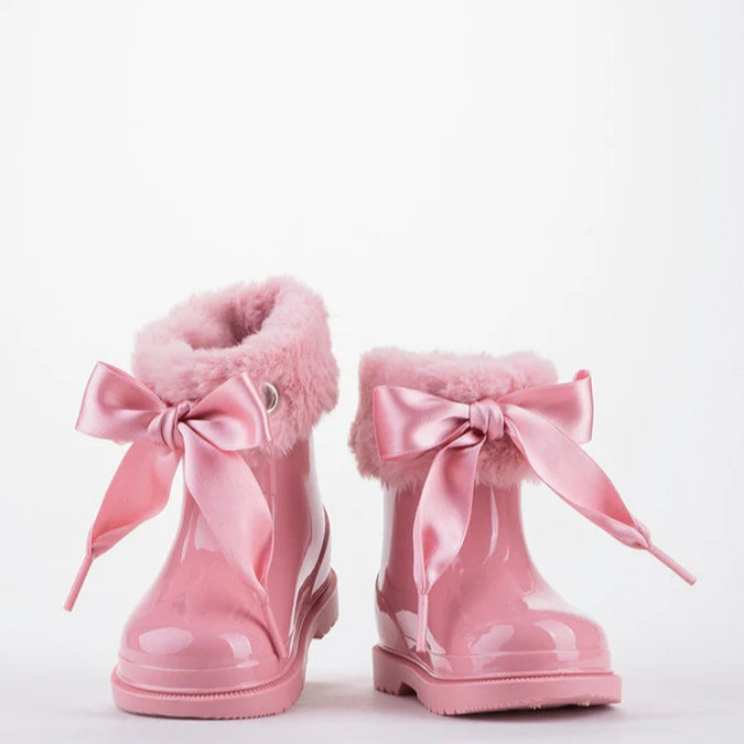 Un toque chic para combinar con tus outfits. Botas caña corta para niñas monocolor. Hecho en España, con acabado brillo, tienen detalle en el cuello un lazo en seda y peluche para hacerlas más elegantes, son ligeras, prácticas y flexibles para sus pies.