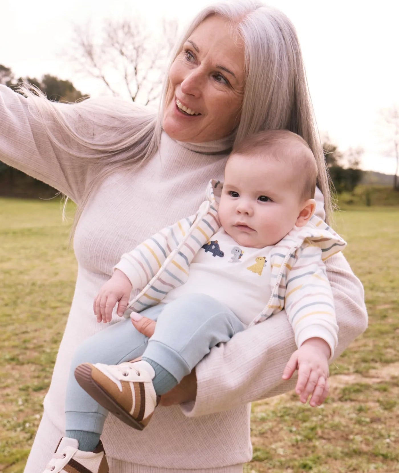 Canguro de manga larga para bebé de cuello con capucha, cierre central delantero con cremallera y bolsillo lateral. Elementos de adorno: apliques decorativos, bordado, botón decorativo. Motivo de rayas.