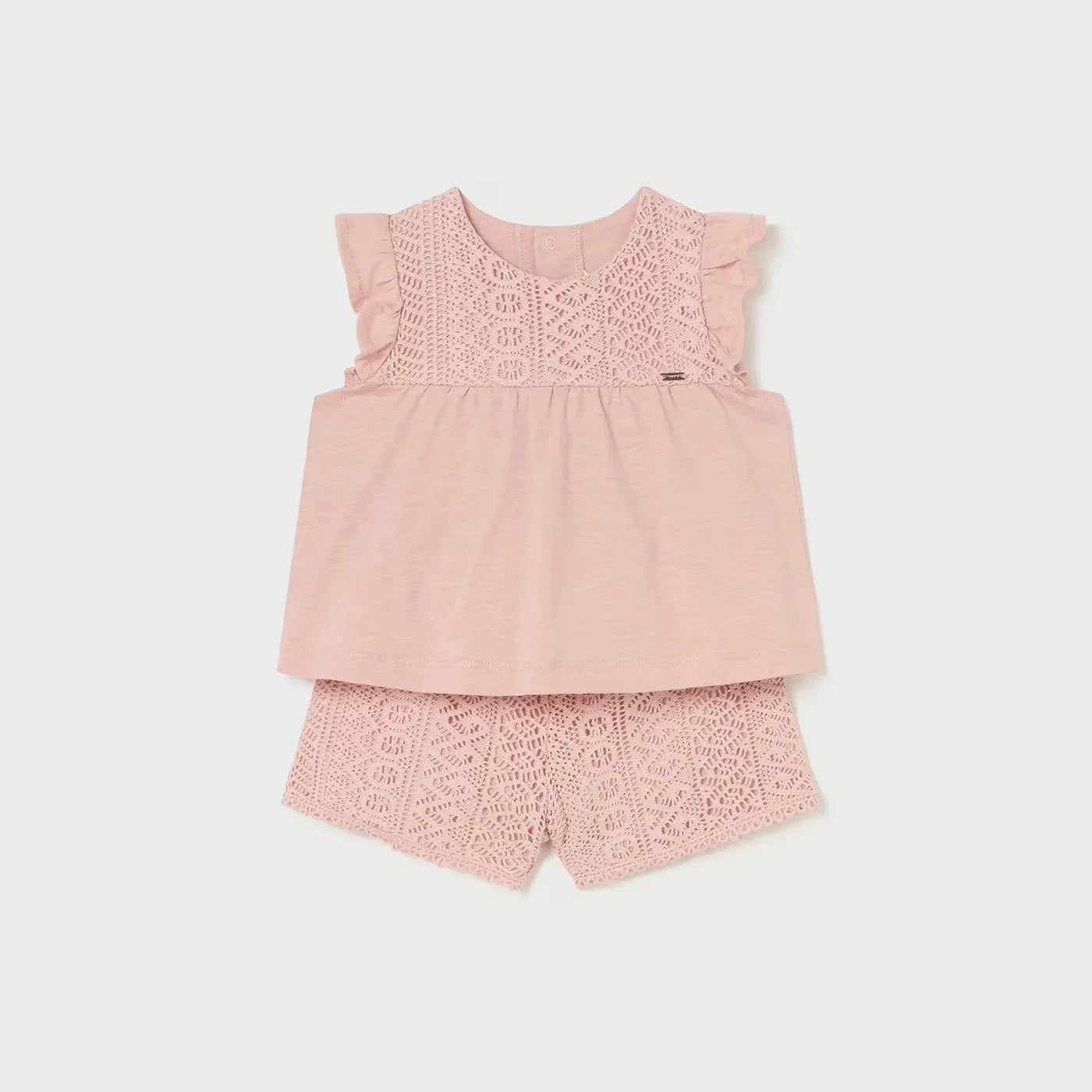 Delicado conjunto para bebe niña ideal para los días de verano; compuesto por blusa manga sisa con golas, botones en la espalda para facilitar la puesta de la prenda y short en croché en tono rubor.