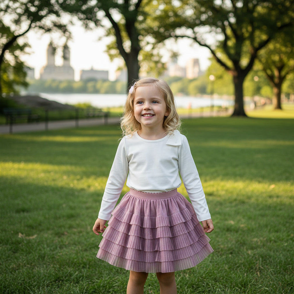 Falda plisada para niña con cinturilla elástica. Confección en capas de tejido de tul plisado ligero y vaporoso.