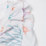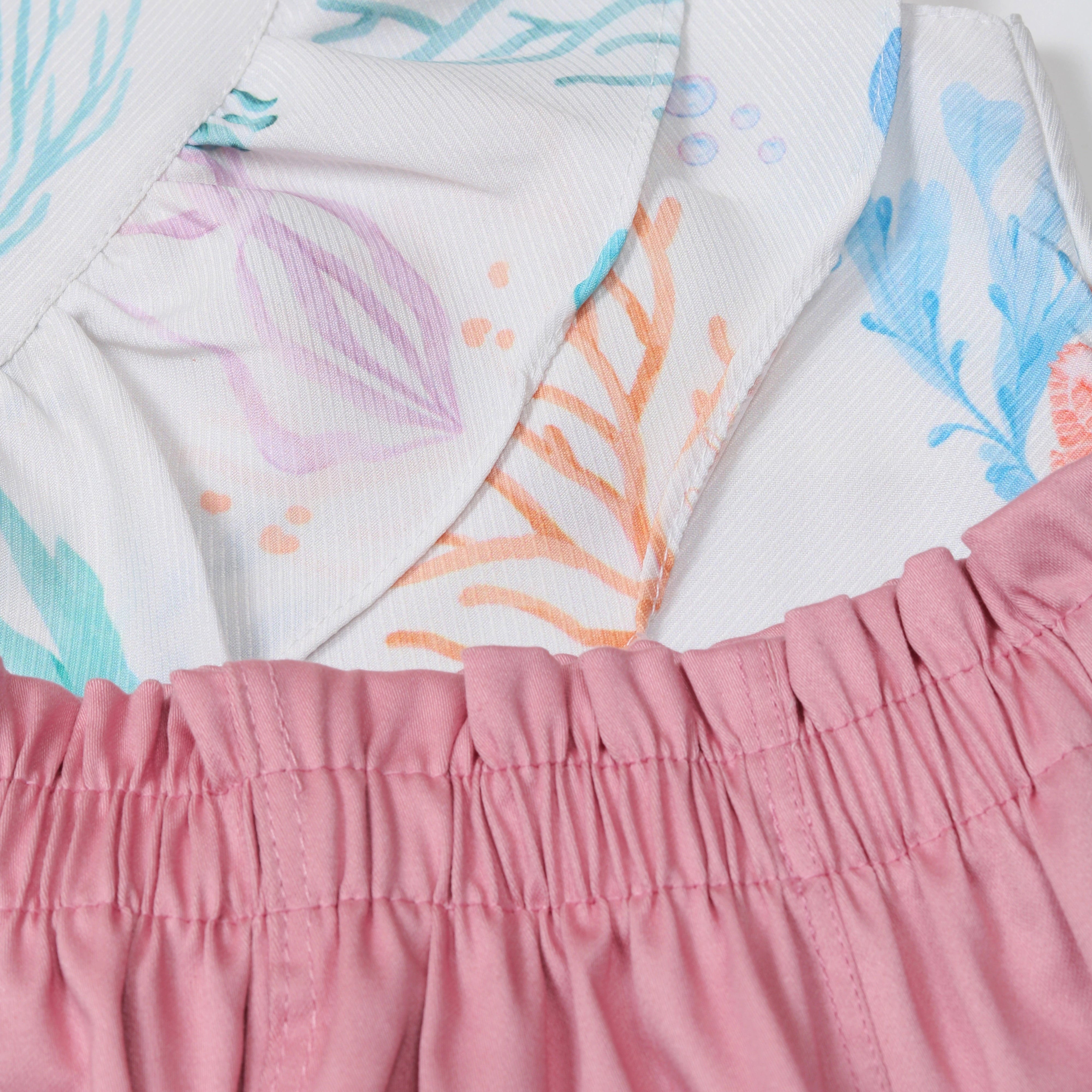 Descubre nuestro encantador conjunto de blusa blanca manga sisa con boleros cruzados, con un lindo estampado de plantas y animales marítimos; acompañado con un short en tono rosa de pretina encauchada, que se adapta perfectamente.