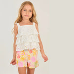 Este hermoso conjunto presenta un vibrante estampado tropical en el short que evoca la frescura de la temporada.