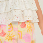 Destacando la blusa de tirantes elaborada en ojalillo con caída en 3 golas.