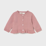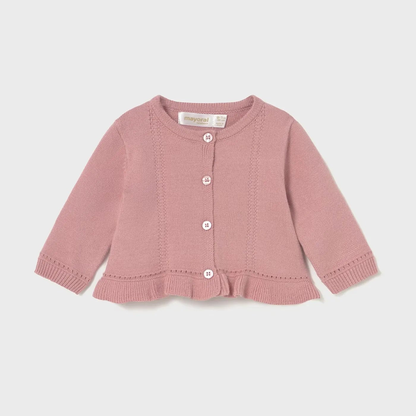 Rebeca de manga larga cuello redondo. Cierre con botones en la parte delantera. Diseño con volante en el bajo de la prenda.