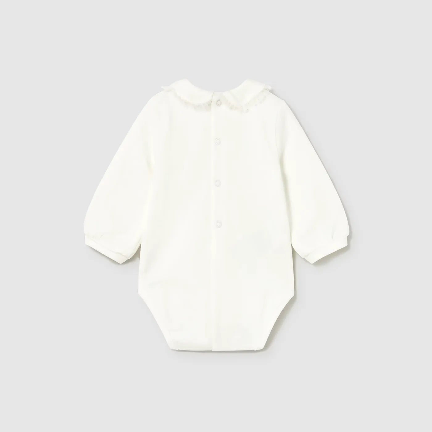 Body de manga larga para bebé con puños elásticos cuello bebé. Cierre con botones a presión en la parte posterior. Botones a presión en la entrepierna para facilitar la puesta de la prenda. Elementos de adorno: volante decorativo.