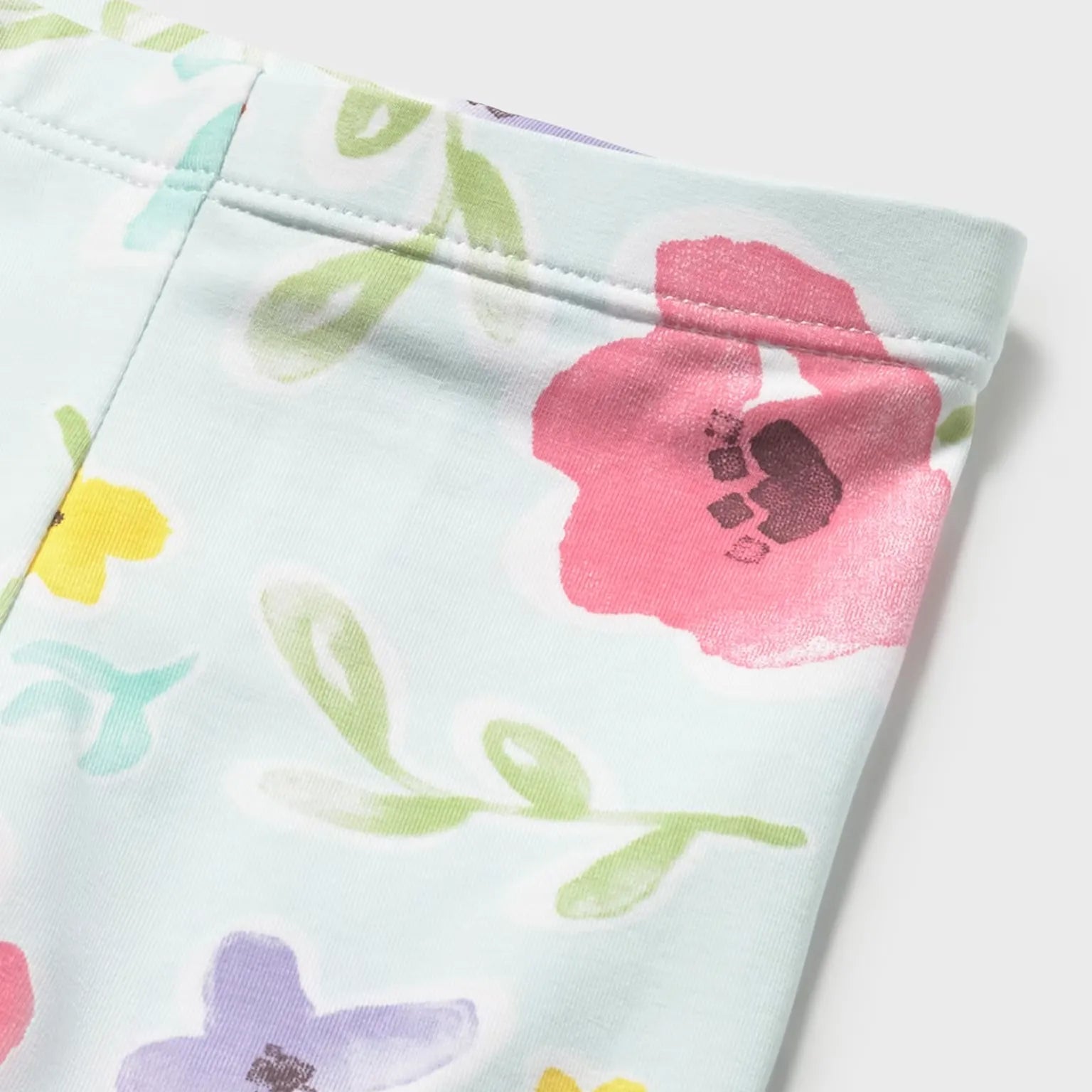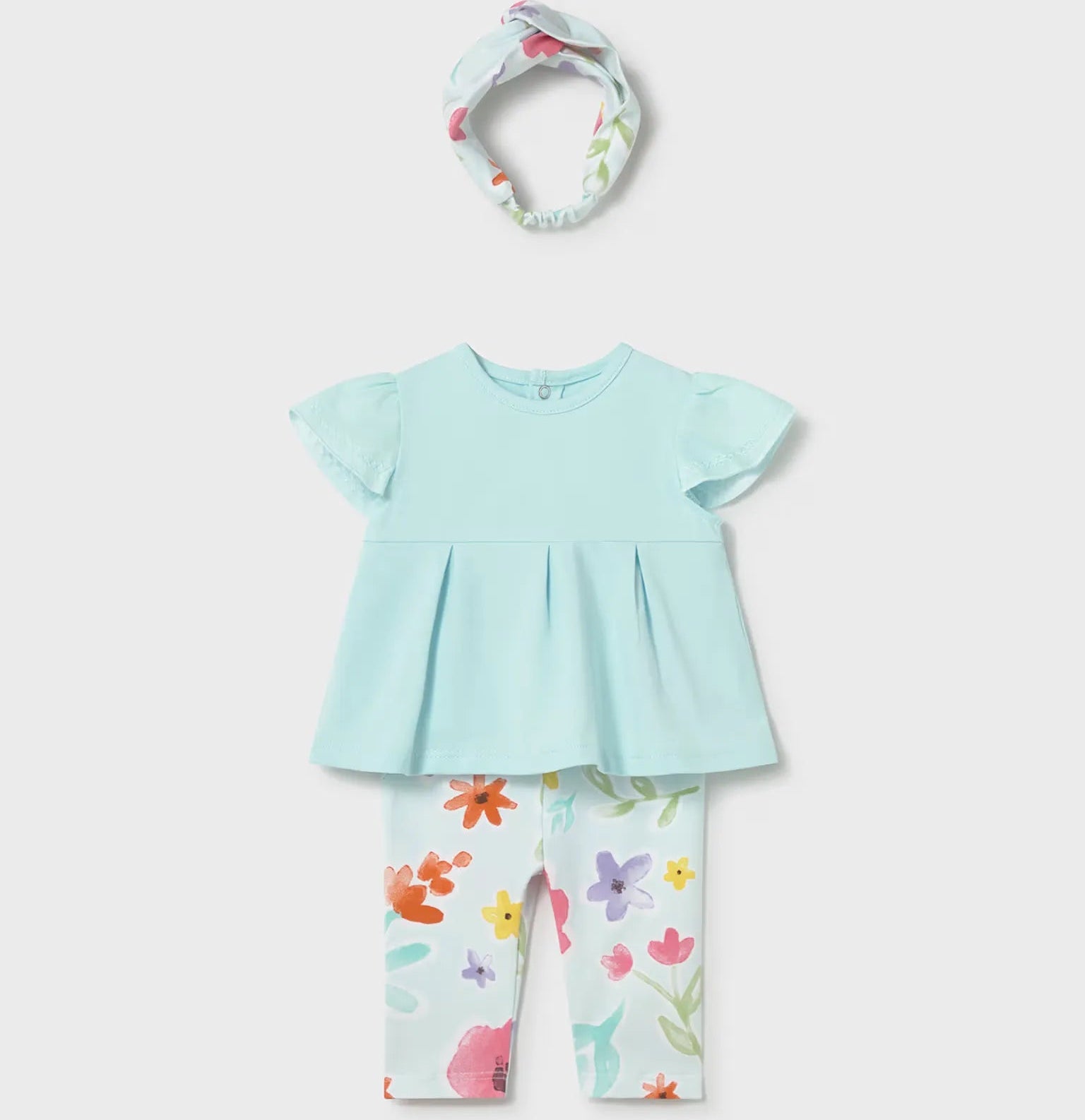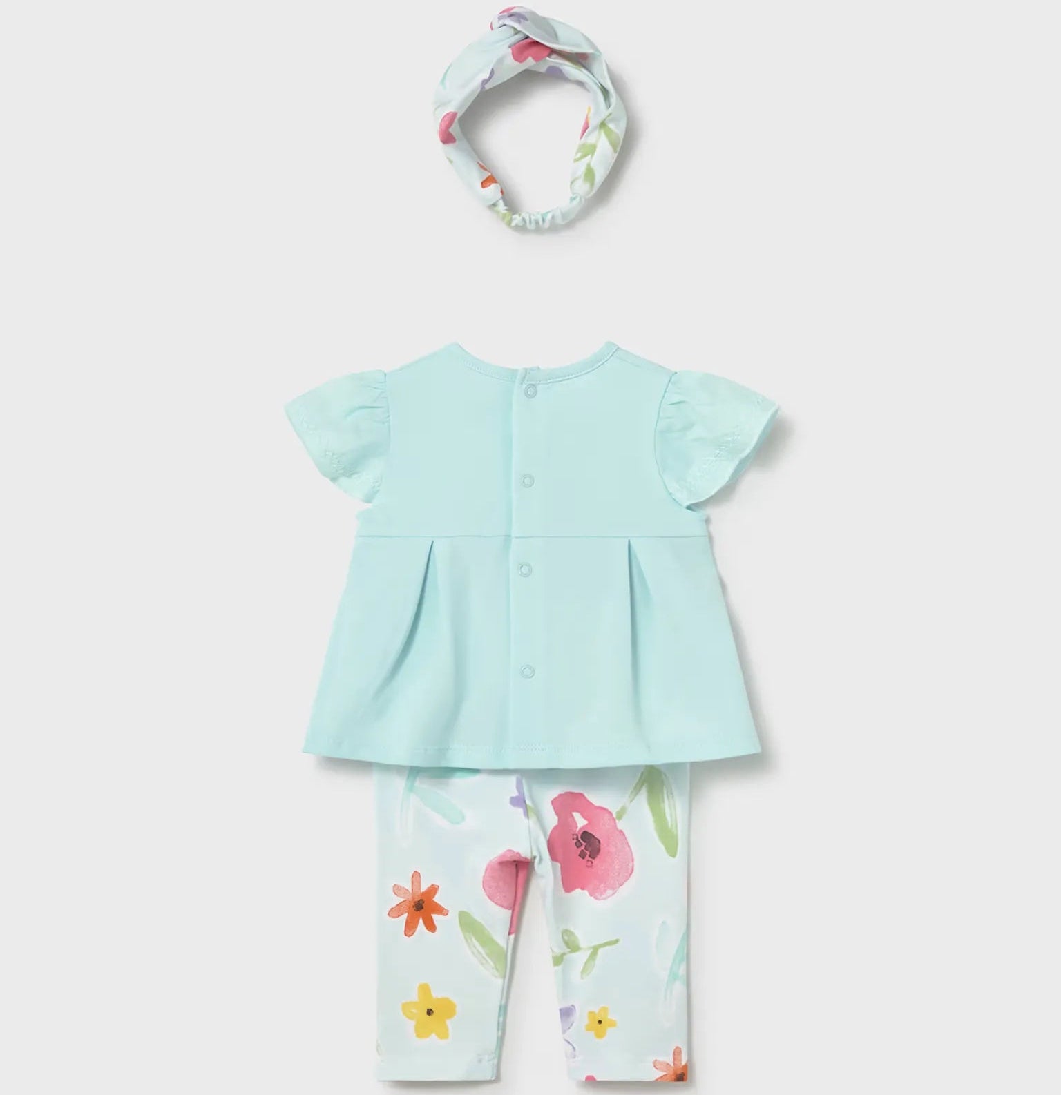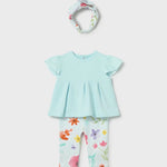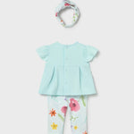 Conjunto de tres prendas para bebé niña, incluye un leggings estampado, blusa unicolor y diadema a tono. Material flexible para un mayor confort y libertad de movimientos.