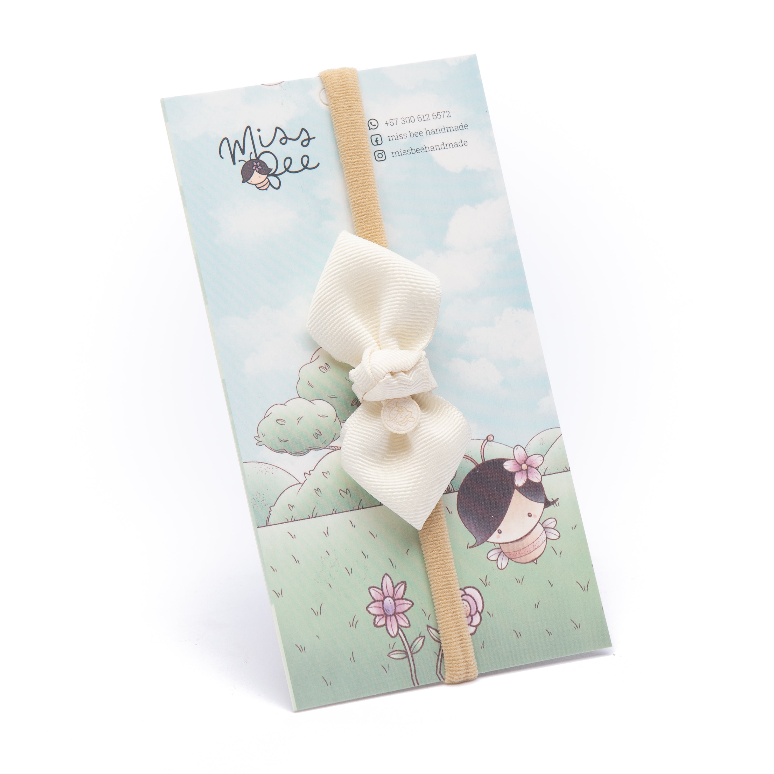 Esta diadema elástica en nylon suave y flexible, se ajusta perfectamente a la cabecita de tu bebé, brindando una sensación de suavidad sin causar presión. El moñito está elaborado a mano en cinta de faya de alta calidad por las artesanas de Miss Bee.