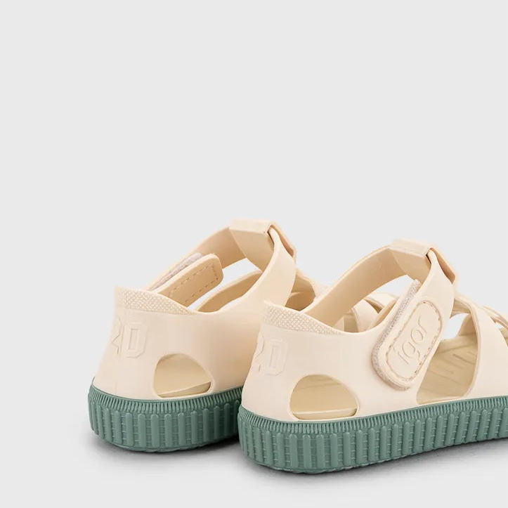 Sandalias en material translucido acabado mate, marca Igor 100%Hecho en España, muy cómodas, flexibles y blanditas. Cierre de velcro al tobillo para mayor seguridad, plantilla extraíble para facilitar su limpieza.