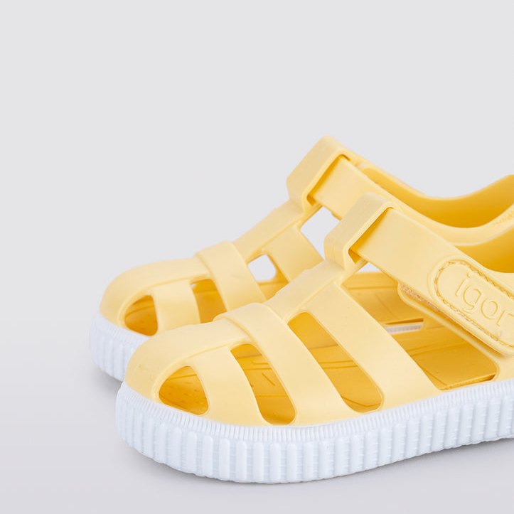 Sandalias en material translucido acabado mate, marca Igor 100%Hecho en España, muy cómodas, flexibles y blanditas. Cierre de velcro al tobillo para mayor seguridad, plantilla extraíble para facilitar su limpieza.
