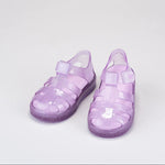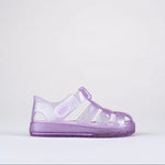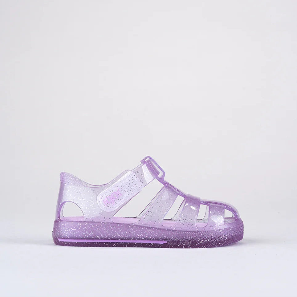 Sandalias STAR para niños de IGOR, material translucido de colores vibrantes, con brillantes de glitter y suelta del mismo color. Perfectas para la playa, la piscina o para disfrutar del día a día con total comodidad. Su diseño en PVC inyectado en una sola pieza ofrece resistencia y flexibilidad, mientras que el cierre en velcro al tobillo permite un ajuste fácil y seguro.