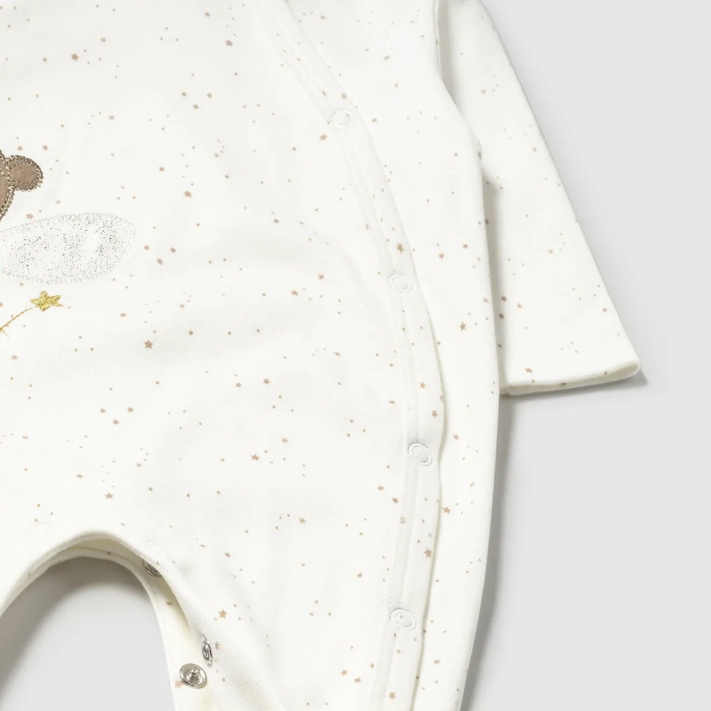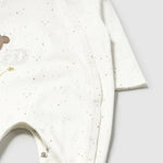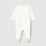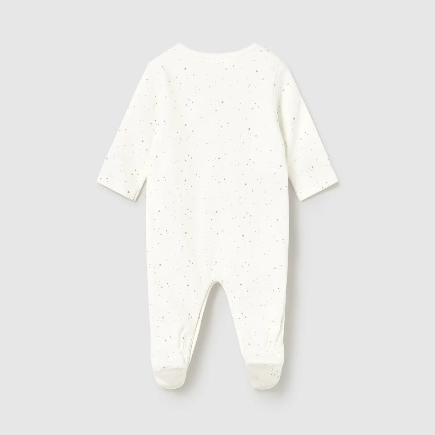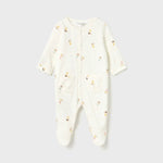 Pelele de manga larga para bebé con puños elásticos en el interior. Diseño con peto simulado en superposición, cierre con botones a presión en la parte posterior.