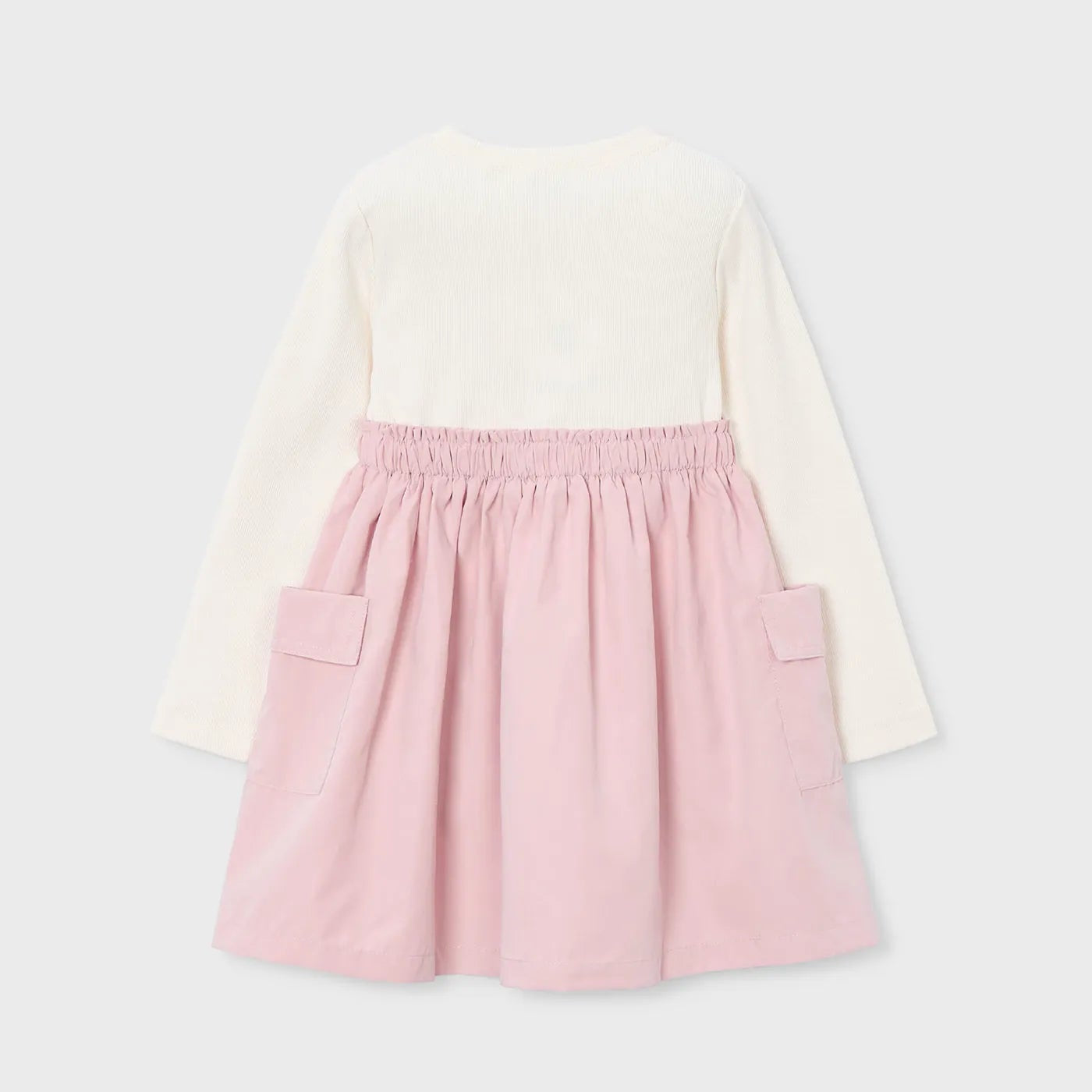 Vestido de manga larga para niña con cuello redondo. Diseño con camiseta en superposición y cinturilla elástica. Confección combinada con cuerpo y falda en distintos tejidos para conseguir un diseño único y especial. Modelo con rizo. Bolsillos en los laterales.