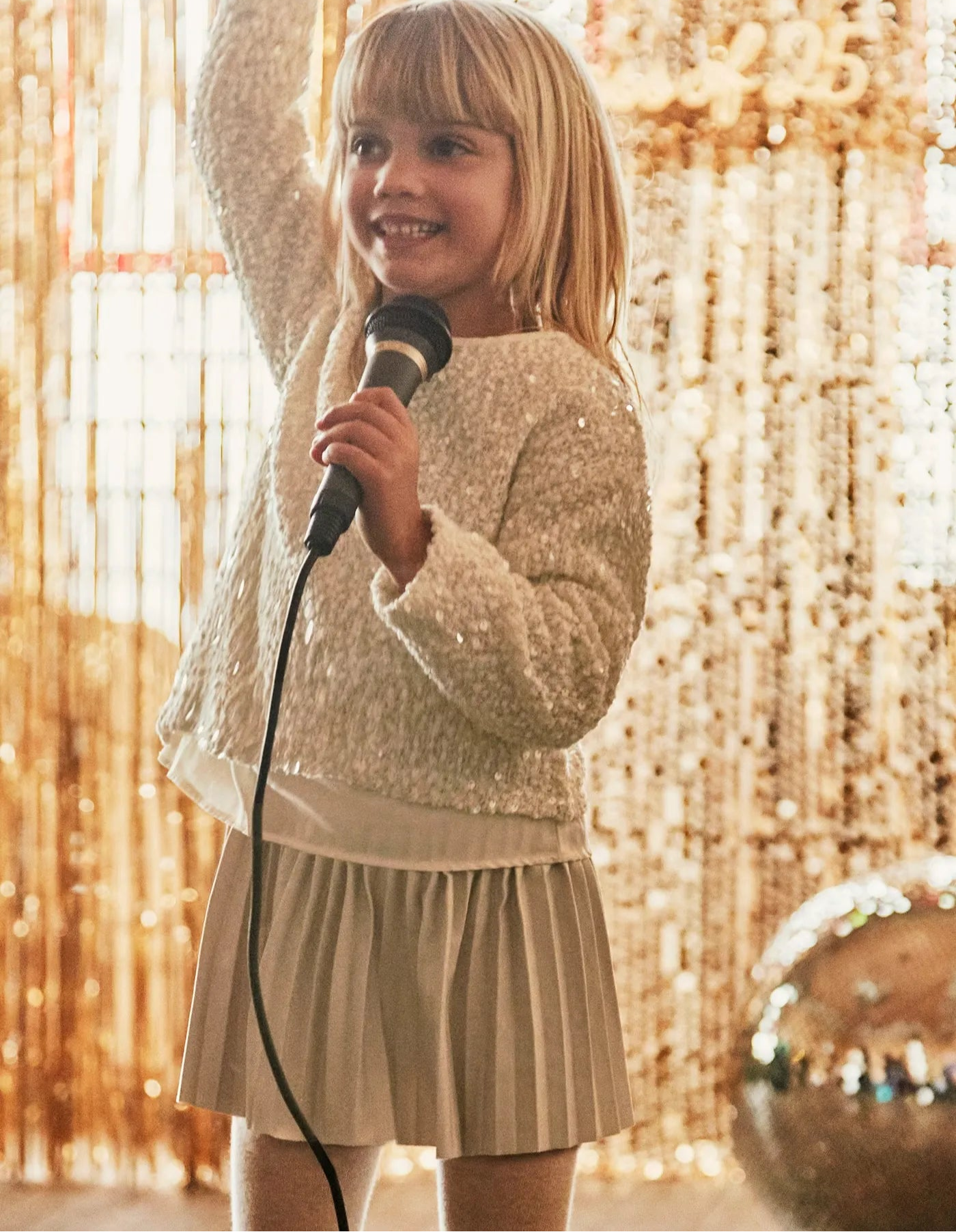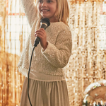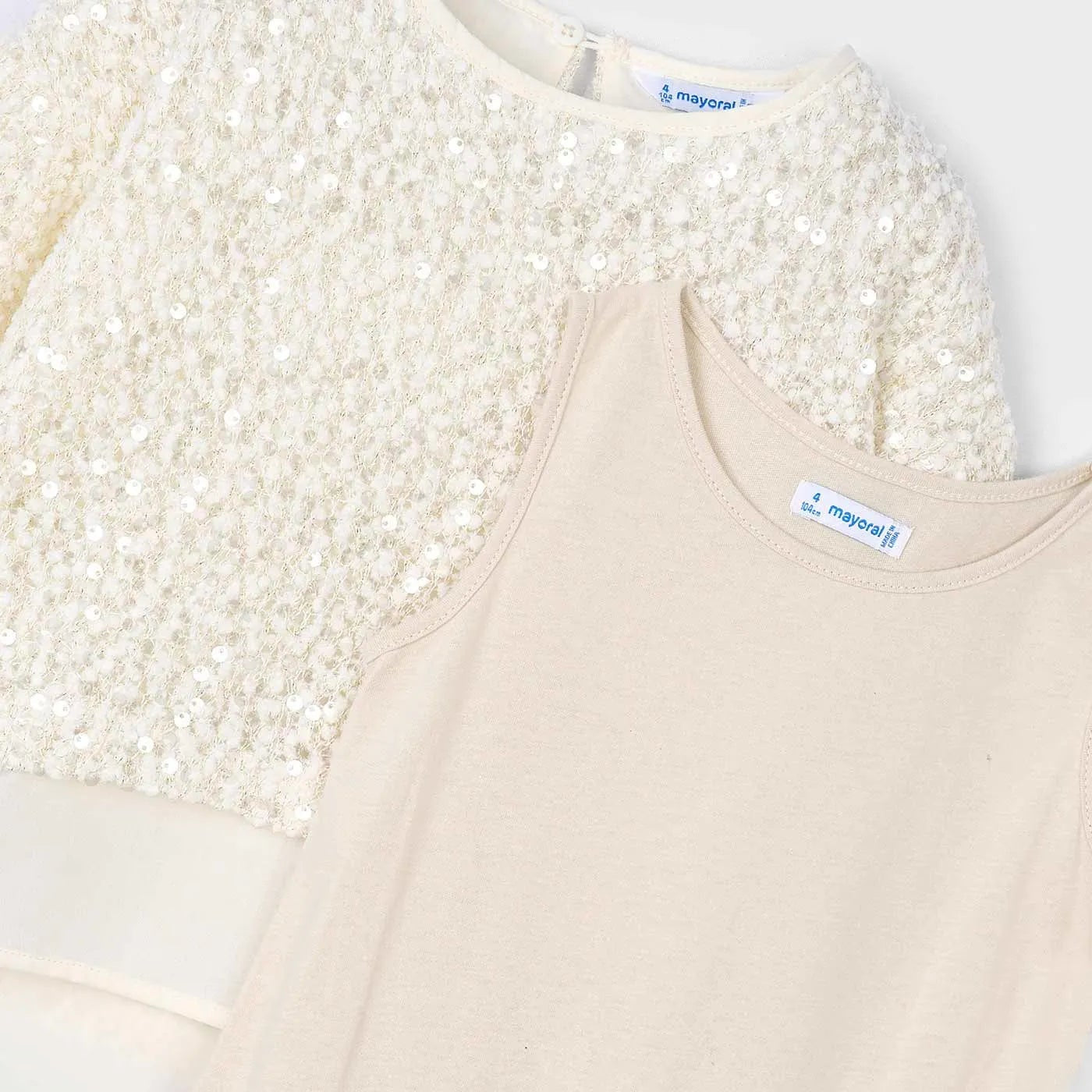 Blusa de manga larga para niña cuello redondo. Diseño simulado con prendas en superposición. Abertura con botón en el cuello para facilitar la puesta de la prenda. Elementos de adorno: lentejuelas.