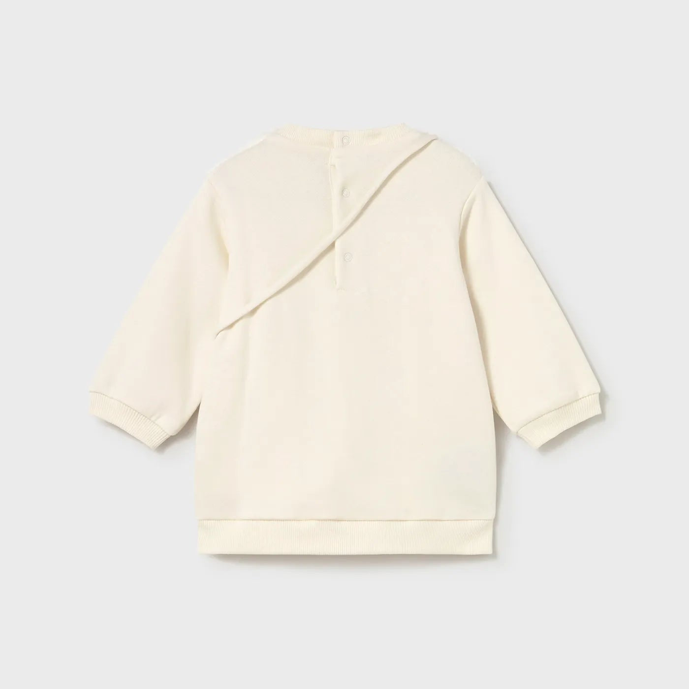 Vestido de manga larga para bebé cuello redondo, cierre con botones a presión en la parte posterior. Modelo con forro interior.
