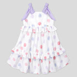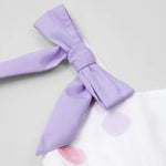 ¡Un vestido lleno de encanto! Su diseño en lino estampado con lunares y tiras de moños lila en los hombros para que lo puedas adaptar a la medida; con botones en la espalda, hará que tu niña luzca adorable en cada ocasión.