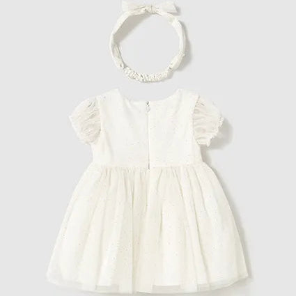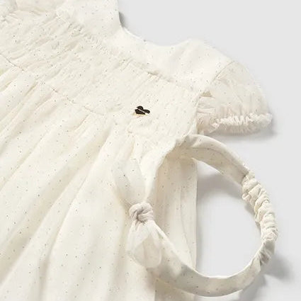 Vestido confeccionado en delicado tejido marfil con sutiles puntos dorados, destaca por su pecho fruncido, mangas abullonadas y una falda ligera de ensueño. Incluye una diadema a juego con lazo, perfecta para completar un look dulce y elegante. Ideal para celebraciones, bautizos o días que merecen un toque mágico